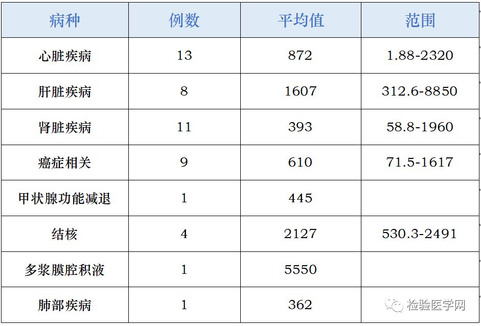从统计的数据来看,存在胸腹水的疾病以心衰、肾衰、肝硬化为多,结核、癌症少见;从检测结果来看,只有一例胸水结果为3.5U/L,为正常水平,其余均增高,计数在内的标本CA125平均水平为1280U/L,超出正常水平24倍之多;从疾病分布来看,多浆膜腔积液中的CA125水平最高,结核次之。